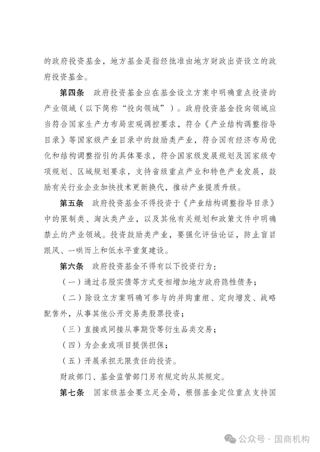 四部门联合出台的《工作办法》,是对政府投资基金投资行为的“事前谋划”和“事中指导”,明确了基金的投向,提出了正、负面清单,为规范基金投资行为、更加突出政策性导向作了细致规定。一是对政府投资基金投资行为提出了底线要求。《工作办法》明确了所有政府投资基金必须遵守的原则、禁止投资的行为,这对于防止政府投资基金偏离政策导向具有极强的约束力。二是允许各地因地制宜确定基金投资重点。为体现因地制宜发展新质生产力的要求,《工作办法》要求各地结合自身财力、产业资源基础等情况,制定各省政府投资基金的重点投资领域清单,以防止各地盲目跟风和低水平重复建设。