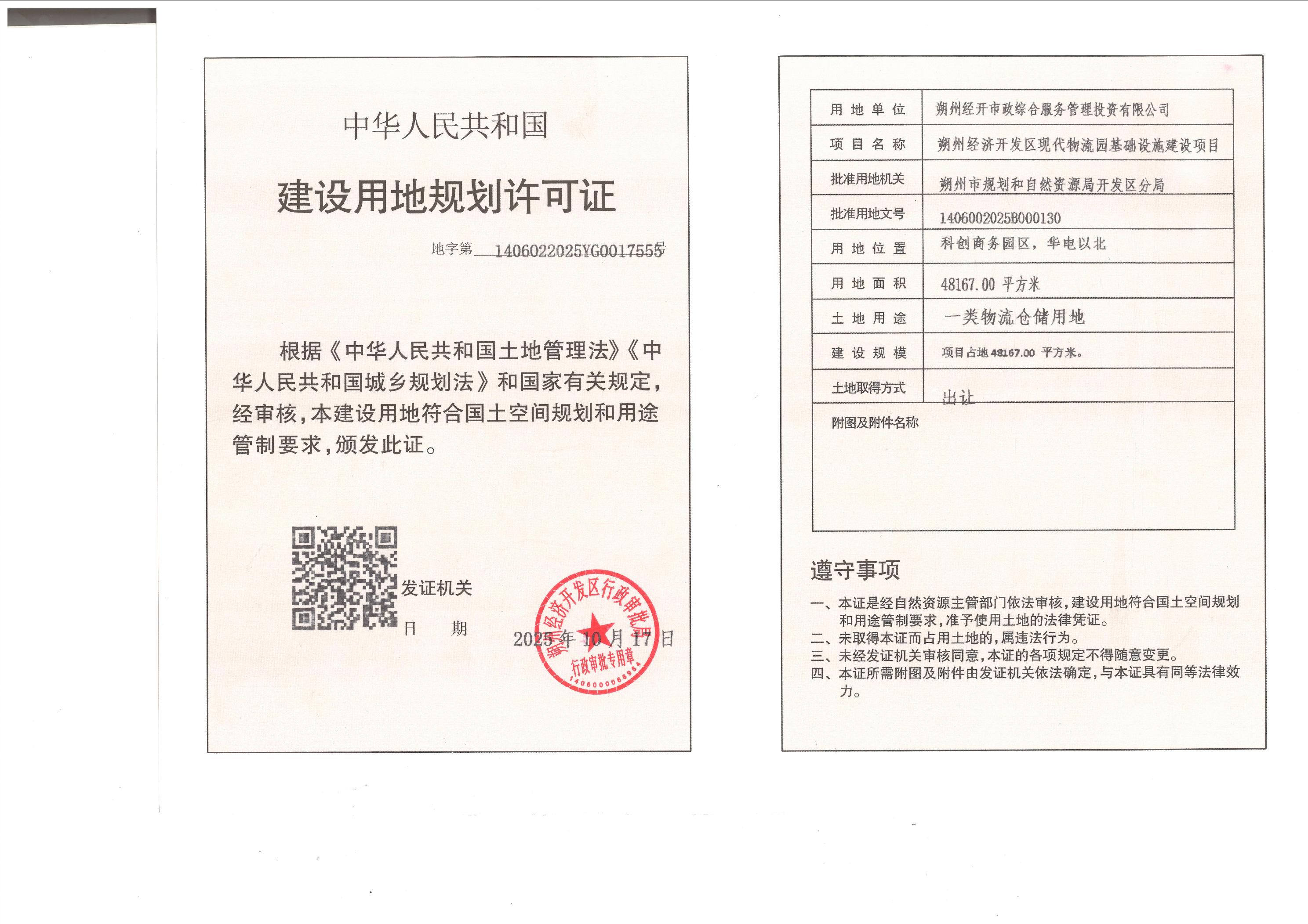 关于对朔州经开市政综合服务管理投资有限公司朔州经济开发区现代物流园基础设施建设项目用地规划许可证的公示