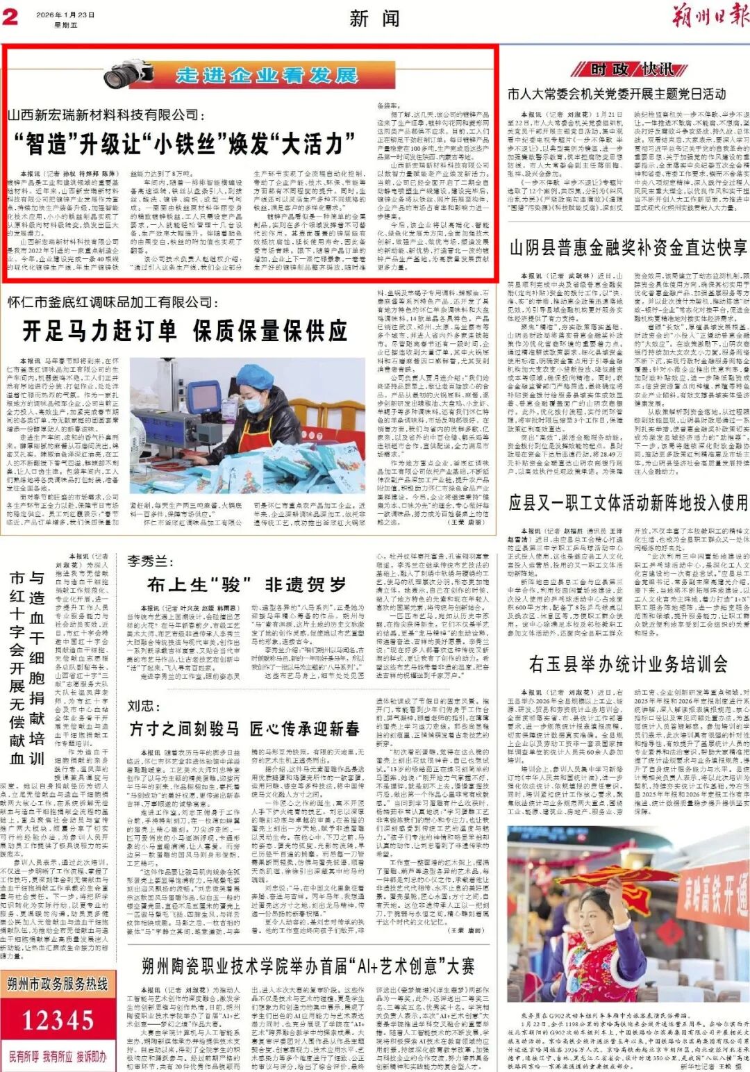 编者按:一根铁丝的 “逆袭”,藏着传统产业转型的密码。山西新宏瑞新材料科技有限公司把镀锌产业发展作为重点,持续加快生产装备升级,以高端化、智能化、绿色化发展为方向,加强智能化技术应用,推动镀锌产业不断从“制造”迈向“智造”。1月23日,《朔州日报》对此进行了报道。