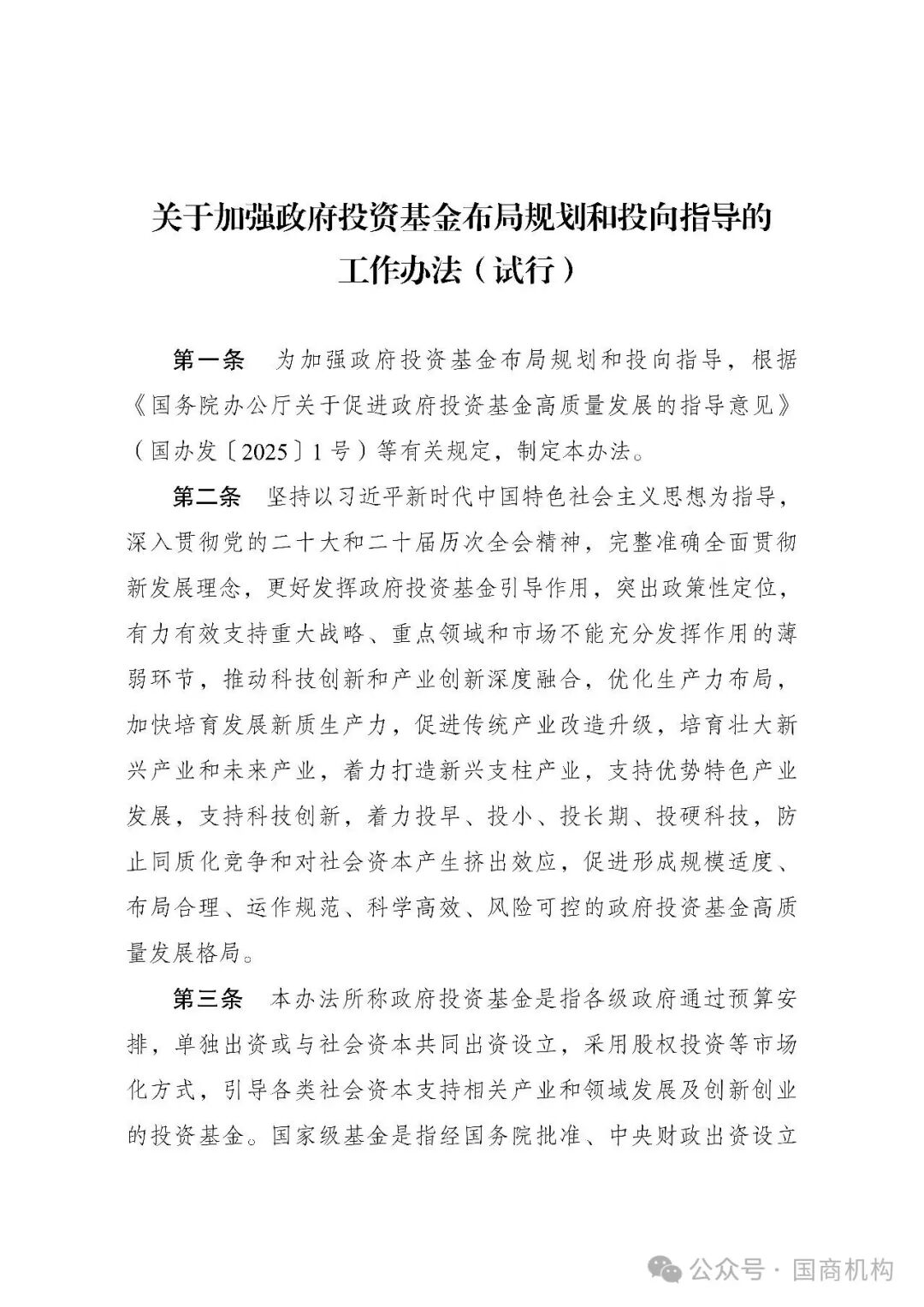 为贯彻落实党中央、国务院决策部署,根据《国务院办公厅关于促进政府投资基金高质量发展的指导意见》(国办发〔2025〕1号)要求,加强对政府投资基金布局规划和投向指导,更加突出政府引导和政策性定位,现制定《关于加强政府投资基金布局规划和投向指导的工作办法(试行)》。现印发给你们,请按照执行。